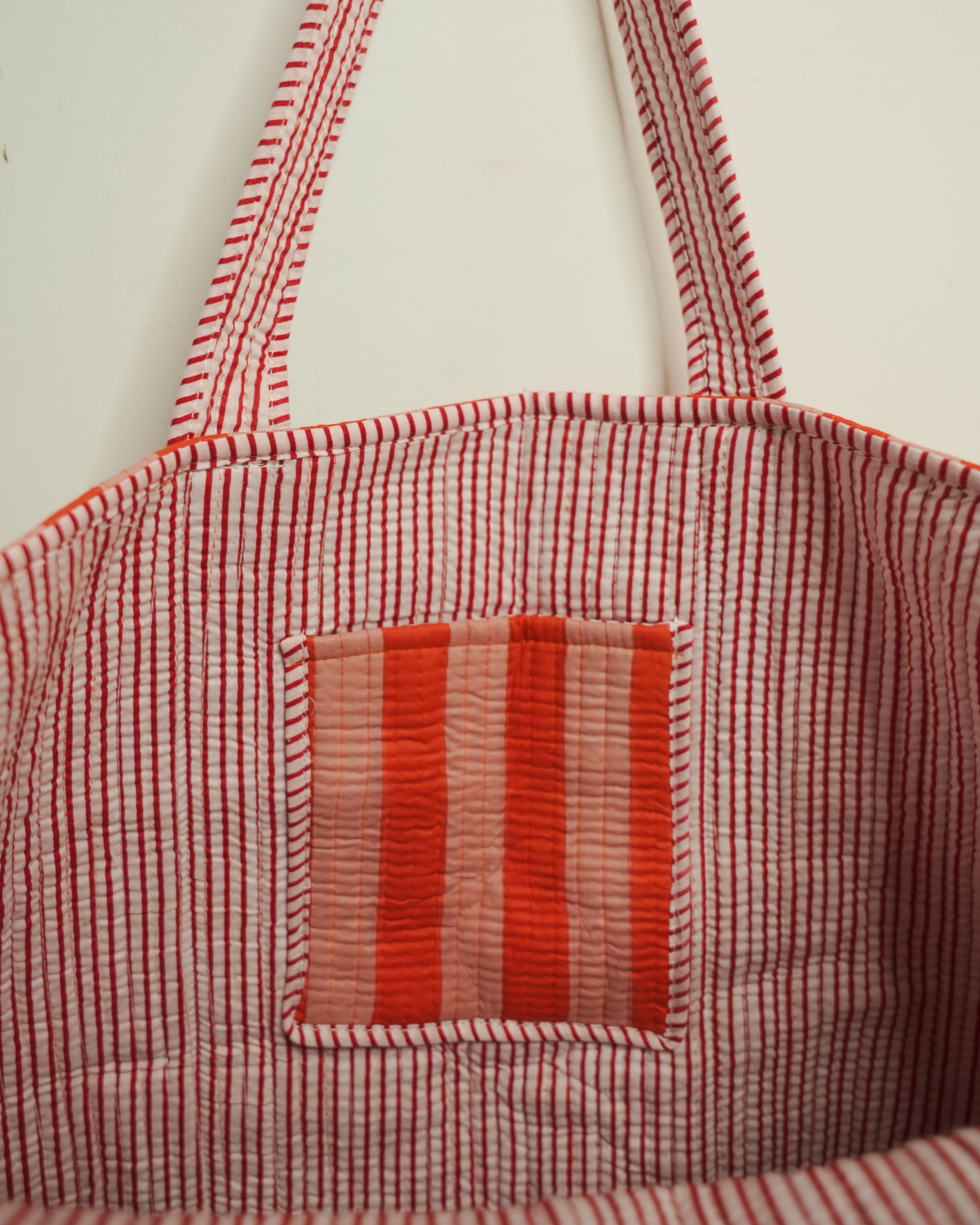 Coral and blush striped quilted cotton tote bag with long handles – lightweight everyday carryall.